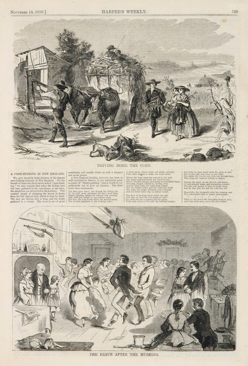 DescriptionTwo wood engravings on page 729 of Harper's Weekly, 13 November 1858. Four short columns of text between engravings; verso, completely printed with text in four columns. Two rural scenes, one exterior scene of harvesting and delivery, one interior of ballroom with dancers in line, observers, couples in colloquy, and fiddler and horn player.
