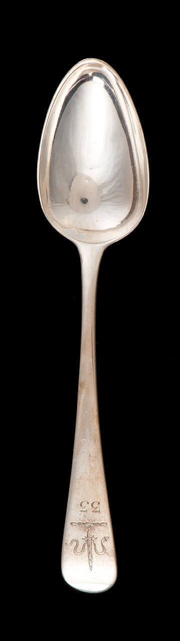 DescriptionOne of a set of 33 silver spoons (from an original set of 70) each individually engraved with a number from 1 to 34 with no. 30 missing. All also engraved with the crest of the City of Chester (snake and sword).