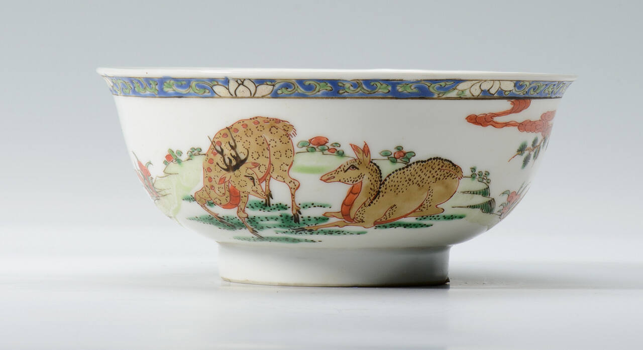 DescriptionOne of a pair of porcelain bowls. Decorated in scene, three color enamel, two gold deer. Floral band at lip in heavy blue-green and white enamel.ProvenanceWith C. T. Loo & Co., Paris, no. 30.208, by July 8, 1933-1934 [1];