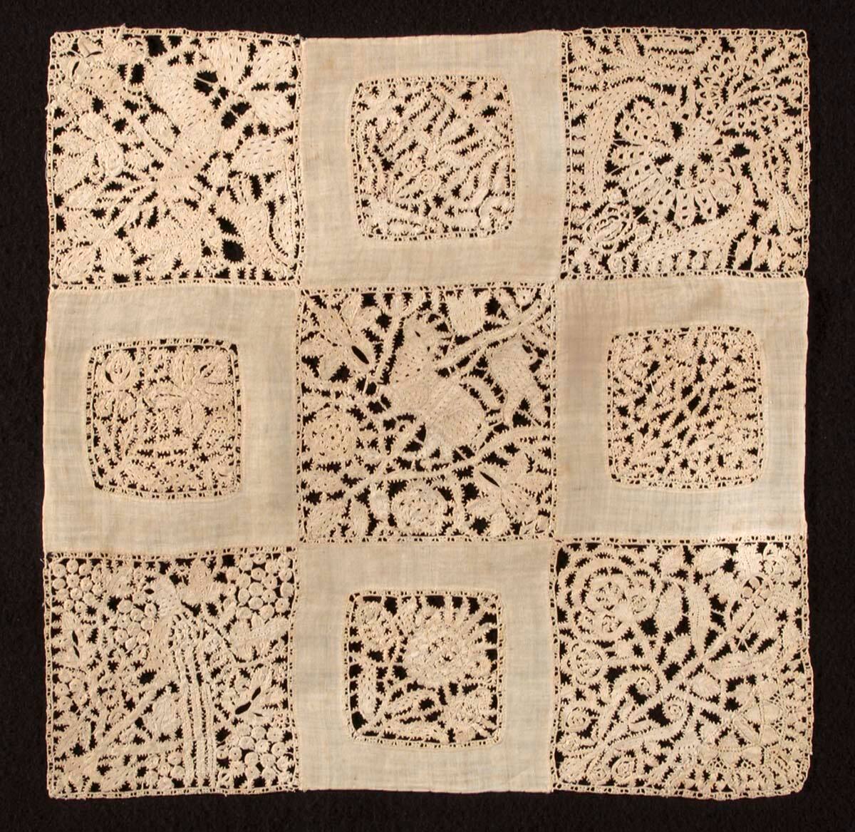 DescriptionSquares of linen, inset with panels of needle lace, alternate with squares of needle lace. The needle lace is solidly worked with thick thread in rows of buttonhole stitch, relieved with some lines of openings, and with picots along the edges. The lace panels are attached to outer lines of plaited threads and linked to the linen with insertion stitches in imitation of cutwork. The small squares set in the linen are filled with floral forms and, in one case, possible with a monogram. The larger panels contain flowers and animals, including in the central panel, the Lamb of God with cross and flag.