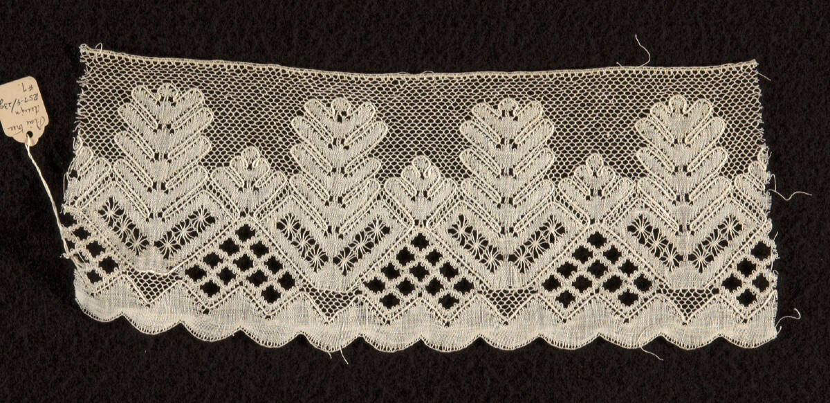 DescriptionBobbin-made straight lace combining features of Torchan and Buckinghamshire-type laces.