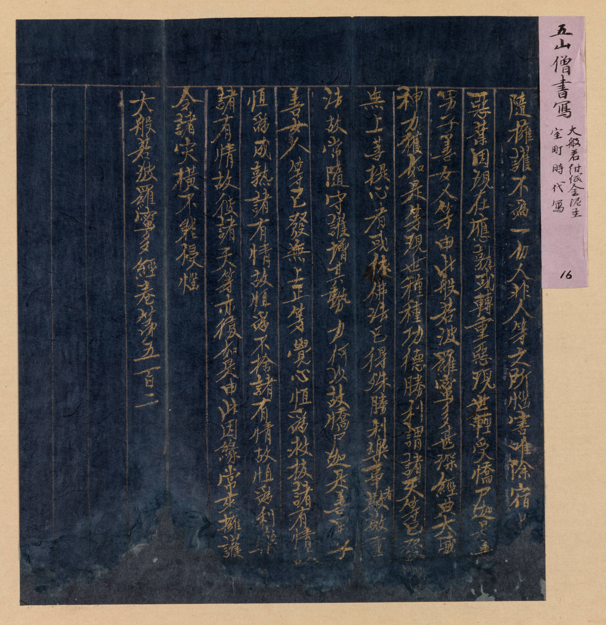 Section of the Greater Sutra of the Perfection of Wisdom (Daihannyakyō) known as the "Gozansōkyō gire" (Gozan monasteries sutra fragment)