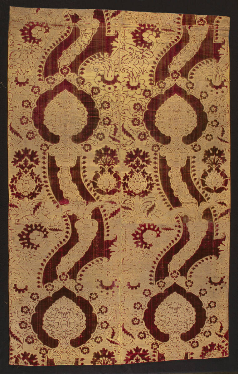 DescriptionRed silk pile on a background originally of metal thread and yellow silk. All the metal thread is missing. The panel has been put together from two selvedge widths of velvet, but the component pieces are patched and joined in places.Gallery LabelThis large panel is an example of the bold floral patterning typical of Renaissance velvets. During this period of exploration and travel, trade expanded and Italy and Spain emerged as major centers of textile production. This panel displays one of the widely used, standardized patterns with large, red, ogee arches (opposed curved arcs) that envelope pomegranates, connected by thick serpentine stems across a flat cream background. The dominant motifs are supported by interlacing vegetation and abstract floral elements.