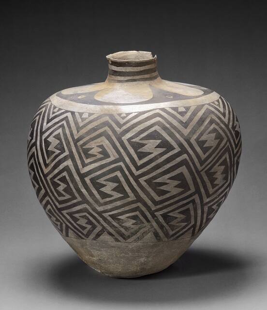 DescriptionLarge black-on-white decorated globular jar (olla) with typical short neck. Old repair on lip of jar with some chip losses. over grey slip isolated within a band of equally weighted black interlocking scroll motifs which terminate in stepped elements. is opposed to a large petal motif situated around the neck of the jar. Three bands of varying widths are placed on the short neck. a fire-cloud is visible as is some warpage to the body of the jar. stress crack is visible on the bottom of the jar.Gallery LabelThe Pueblo peoples of the American Southwest have a long tradition of ceramic arts now considered among the most accomplished in the world. It first flourished around 1,000 years ago within the ancient Anasazi and Mimbres cultures and stands today as an unbroken continuum in both forms and techniques. This monumental jar is exemplary of the hand-built, finely proportioned volumetric shapes that characterize much of the ware. The painted design defines four distinct areas of the jar's form: the neck, shoulder, body and underbody; each has been treated as a separate field, which together establishes a unified pictorial composition.