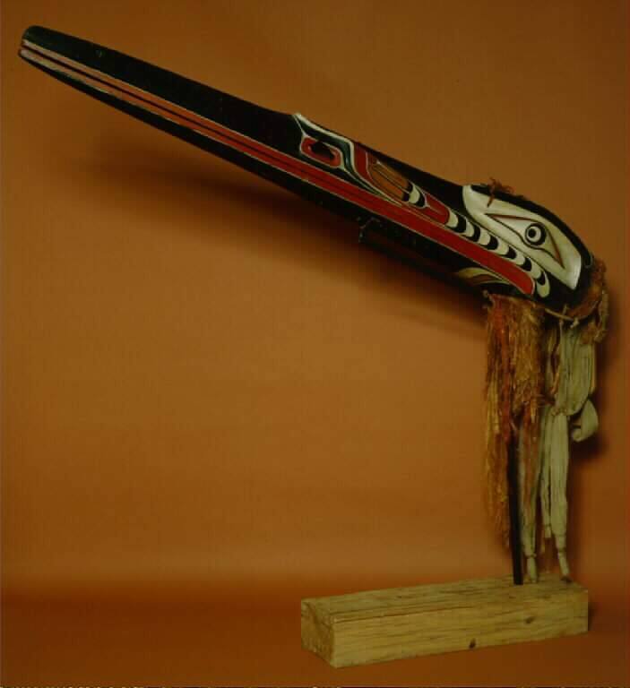 DescriptionA mask depicting Hokhokw, one of the monster birds represented in the most significant winter riturals of the Kwakiutl, the Hamatsa dance, a ceremony which was redolent with ritualistic overtones of cannibalism. It is a masterful carving in wood, painted, and with stripped cedar-bark attachments and hinged so that the entire long beak can be articulated.