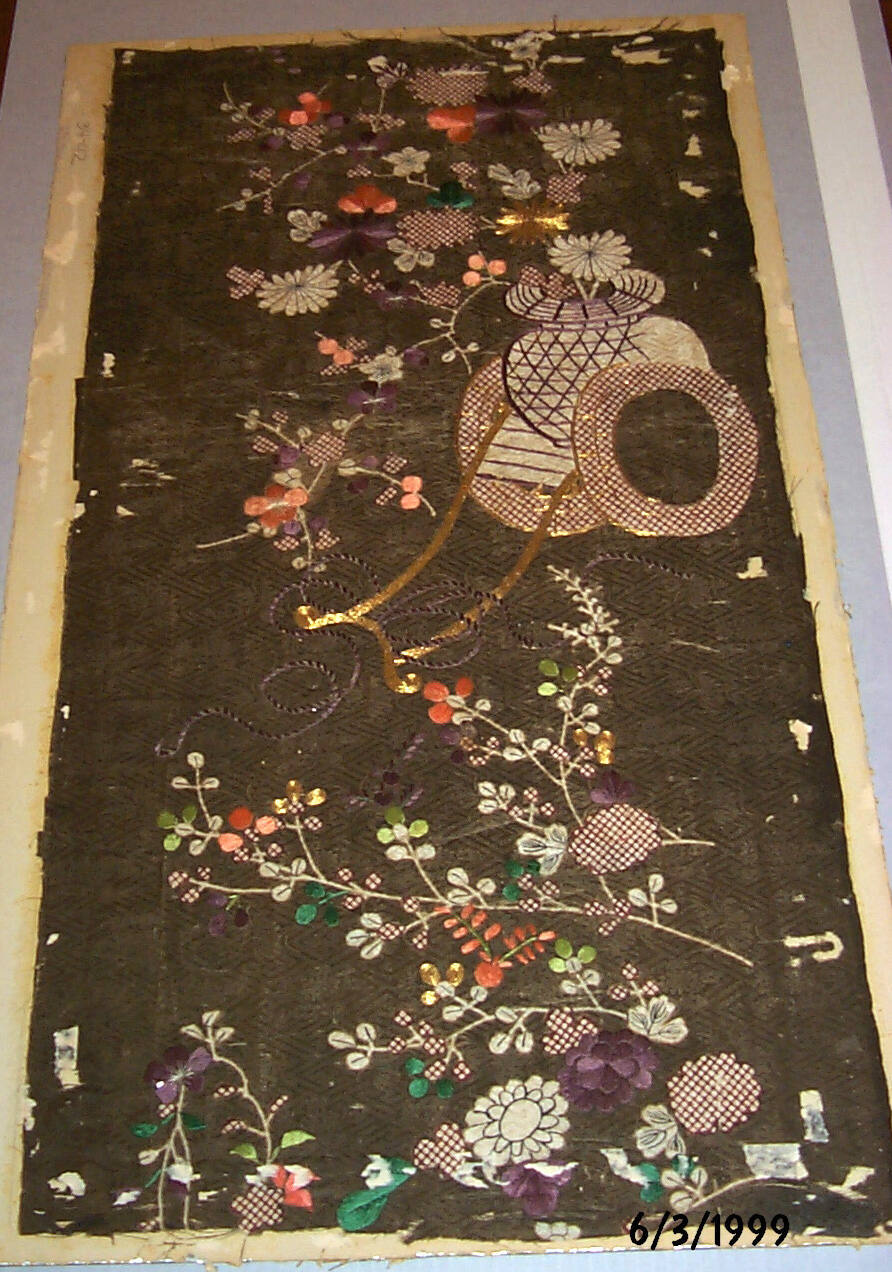 DescriptionBrown-figured satin ground with stencil tie dyeing, paste resis dyeing, silk and metallic thread embroidery. Design of a flower cart and flower sprig.