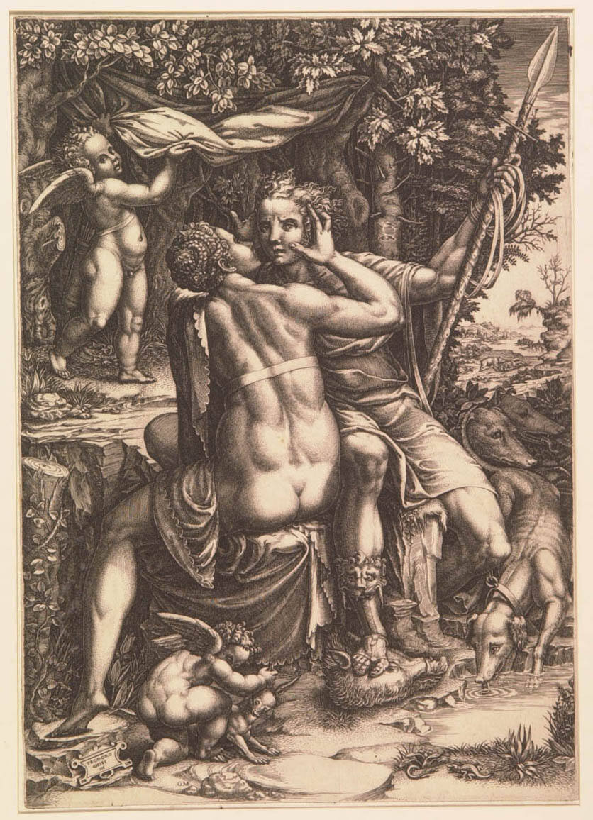 Gallery LabelThe complicated back view of Venus embracing her lover Adonis is a deliberate display of virtuosity on the part of the artist, and her over developed body is inspired by the art of Michelangelo (1475-1564), whose male and female nudes are equally muscular. The cupids refer to Venus' love and the dogs to Adonis, who was killed by a boar while hunting.