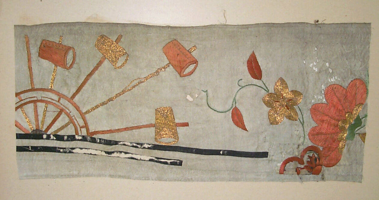 DescriptionWhite figured satin ground with silk and metallic thread embroidery, black ink drawing. Design of water wheel and flowers.