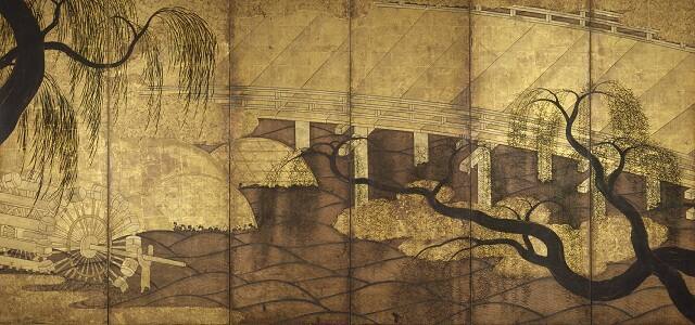 In the painting, the bridge crossing the river is the dominant image of the whole composition, while a waning moon hangs in the sky and a golden waterwheel quietly turns in the water. The undulating waves and showers of green leaves of the willow trees create a rhythmic movement. In the foreground, the silhouette-like willow trees and gesturing branches play against the imposing arching bridge in the background. The audacious use of gold and the opulent design of the composition display a dazzling and luxurious beauty. The Momoyama contribution not only symbolizes the vital energy of its time, but also becomes an inspiration for future artists.