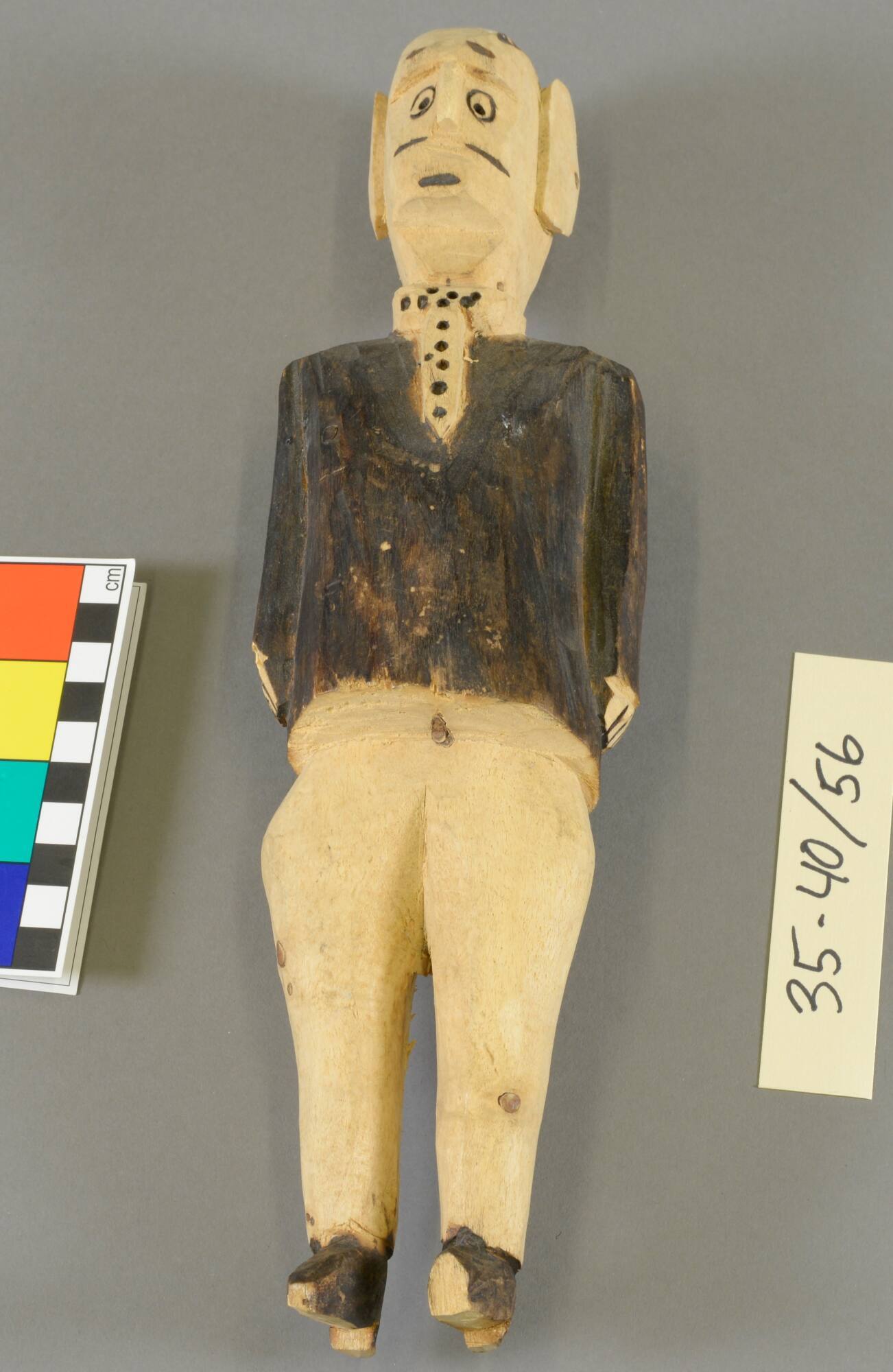 DescriptionCarved wooden figure of man in black coat, polka dot tie, light trousers - all of wood. Arms at sides.ProvenancePearle Scales Moore (1867-1934), Peoria, IL, by 1934 [1];