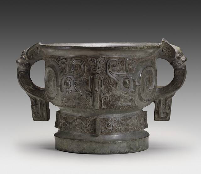 Gallery LabelThe gui was used for offering grain. Although gui were made during the Shang dynasty, they became much more important during Western Zhou and reflect an overall ritual shift from wine to food vessels. Indeed, the Zhou criticized the Shang for having been too bibulous. The coiled dragons on the main panels of this vessel possess ridged bodies and long snouts reminiscent of elephant trunks.
