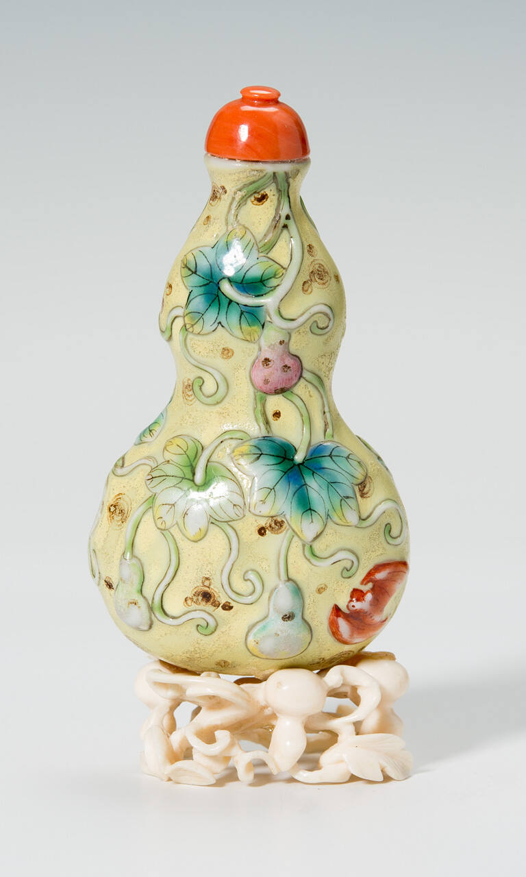 DescriptionIn the shape of a double-gourd, molded with trailing vines supporting large leaves, and small gourds, an iron-red bat in one corner, all on a yellow ground.