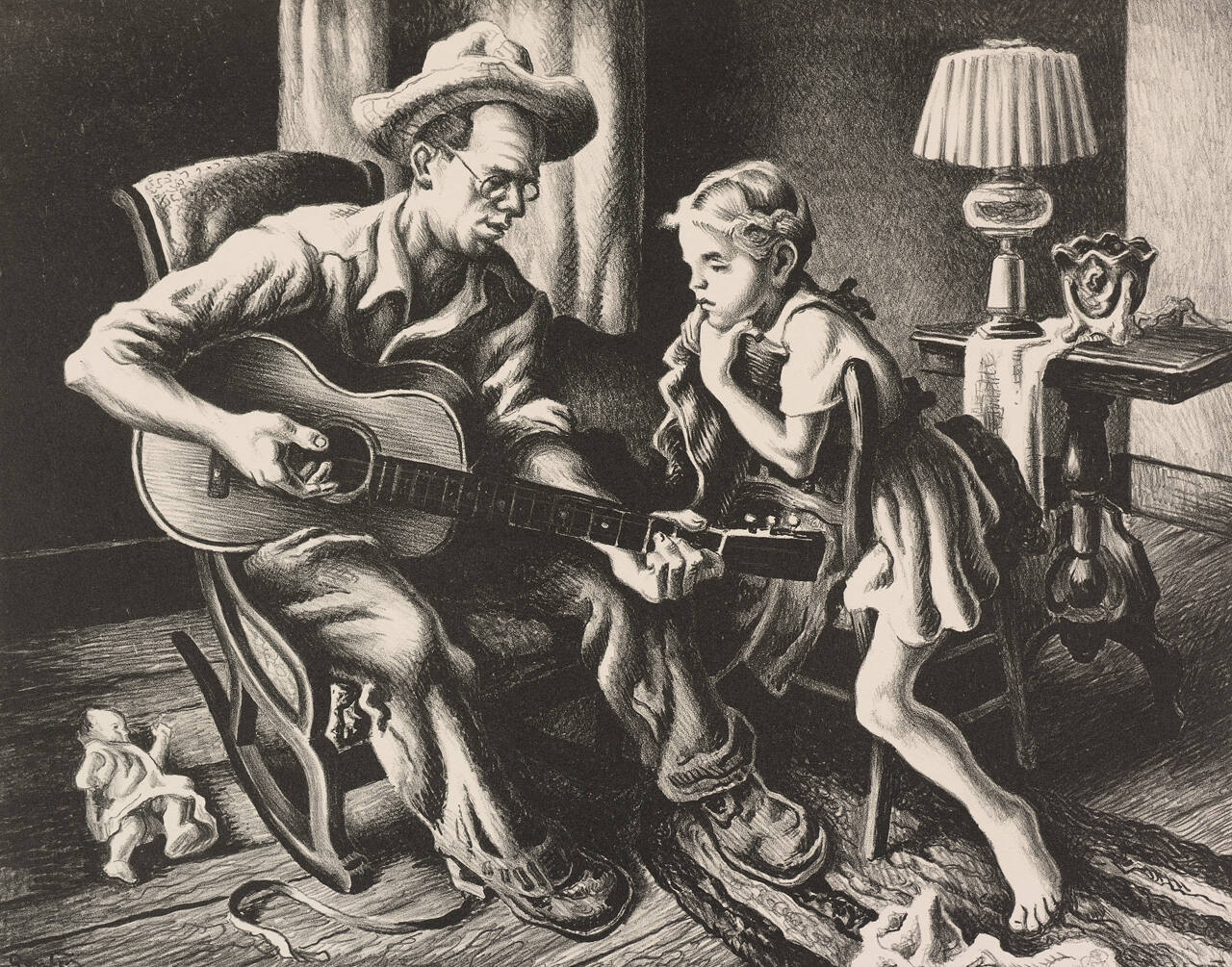 Gallery LabelThe Music Lesson is an example of the contributions Benton made to chronicling American folk music traditions. This intimate, seemingly candid scene pays tribute to E. Gale Huntington, a noted folk singer on Martha’s Vineyard, off the coast of Massachusetts. Benton admired Huntington’s dedication to the preservation of the area’s musical history, showing him engaged in the crucial act of sharing that history with the next generation.