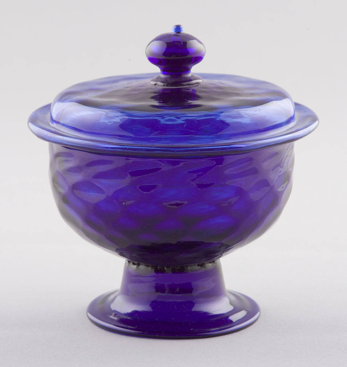 DescriptionRich sapphire blue flint glass, rare form, shallow straight sided bowl, in pattern of medium expanded diamond.