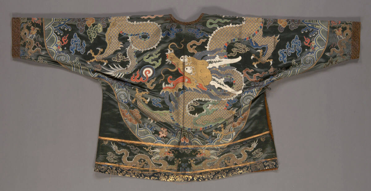 DescriptionDark green satin. Large quatrefoil design with two dragons covering the shoulders and upper part of the back and front. Border of running dragons around the bottom.