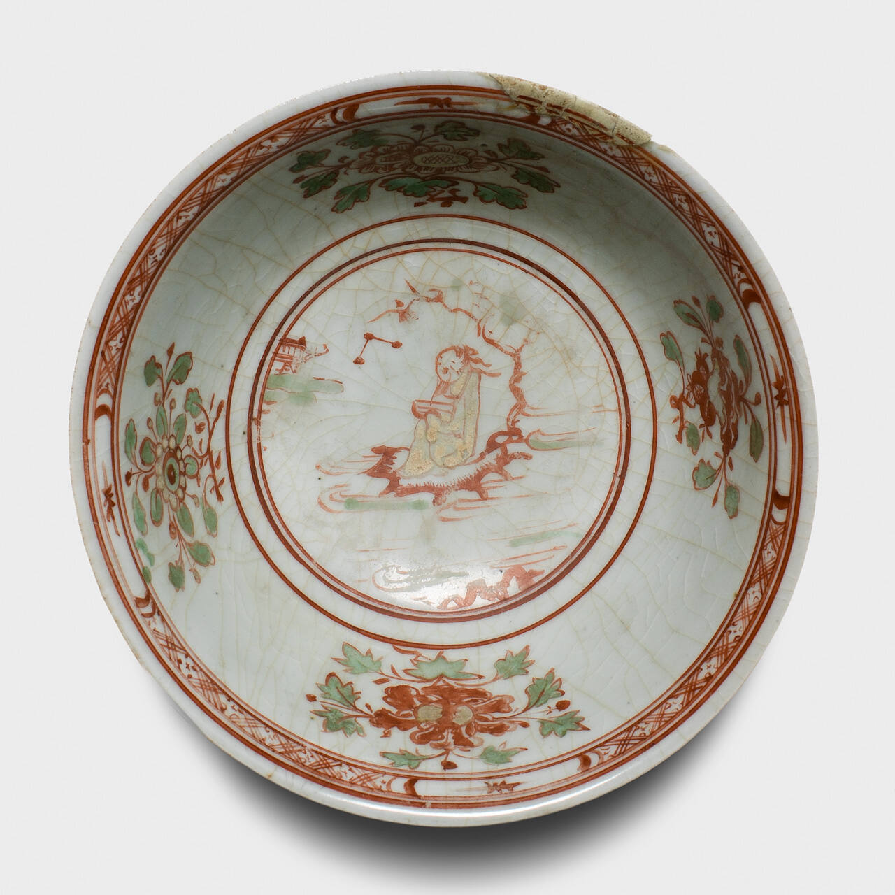 DescriptionLarge flaring bowl; green, red, and yellow over glaze of figures outside, floral decoration inside, poet inside in center.