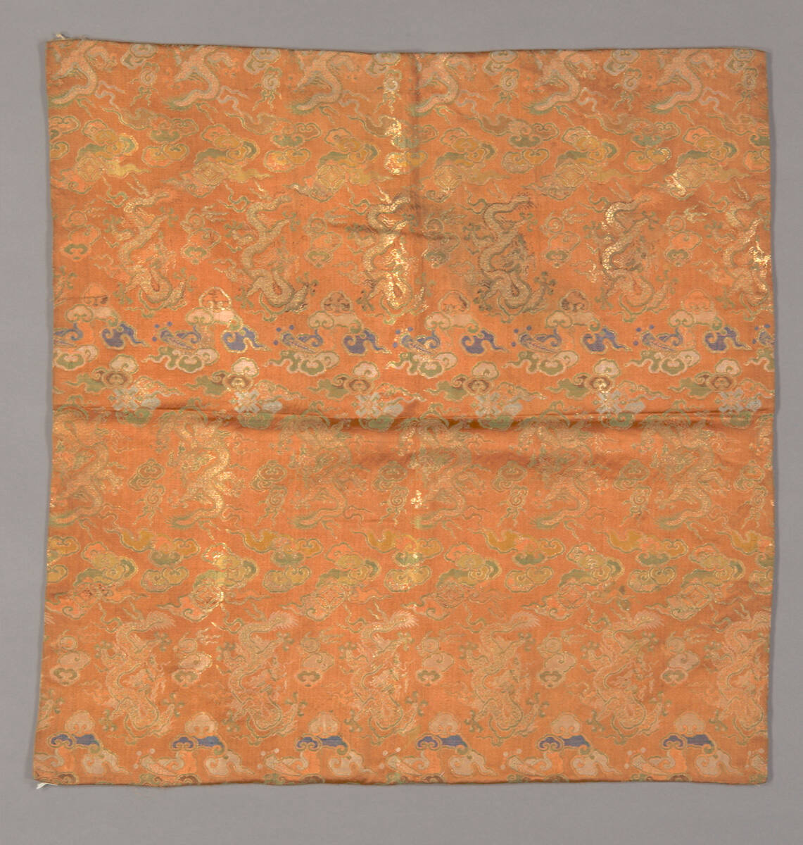 DescriptionOrange satin brocaded in yellow, blue, green, gray and gold thread in a design of rows of dragons chasing flaming jewels, alternating with cloud forms with Buddhist symbols. Lined with rough hemp.