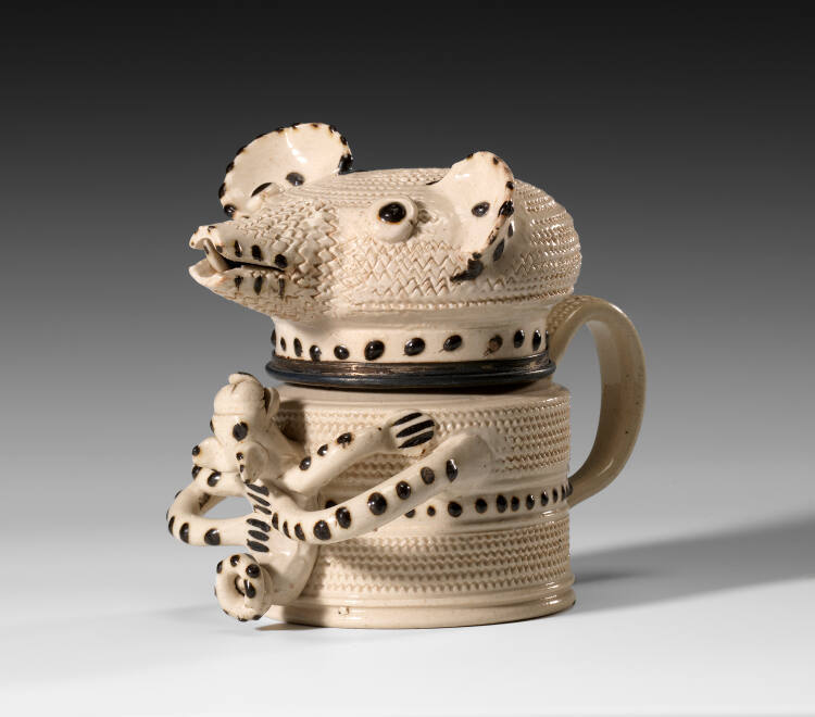 Gallery LabelBoth stoneware and salt glaze were introduced to England from Germany in the 17th century. Salt-glazed stoneware is created by adding common salt, a composition of sodium and chlorine, into the chamber of a hot kiln; the sodium acts as a melting agent and reacts with the clay's silica causing an orange-peel texture. First practiced in London, the medium spread to Staffordshire around 1720. Here, it reached its highest level of technological development and its most varied range of types and forms.
