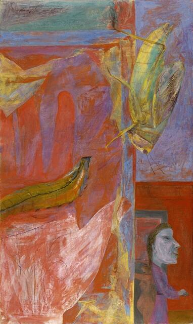 DescriptionVertical in format, this painting is a representational scene with a bright palette dominated by red and yellow. large palm, holding a caterpillar, occupies the left side of the canvas. To the right, a grasshopper symbolically divides the composition between foreground and background. figures appear in the lower right; a nude, pregnant woman stands back to back with a larger woman, clothed with mask-like features and hands clasped.Gallery LabelMy Fate Is in Your Hand was painted five years after the end of World War II. Its jewel-like colors and geometric composition suggest joy and order. However, the caterpillar held in the palm of a hand and the grasshopper clinging to the painting’s vertical edge are reminders that forces beyond our control can affect our lives.