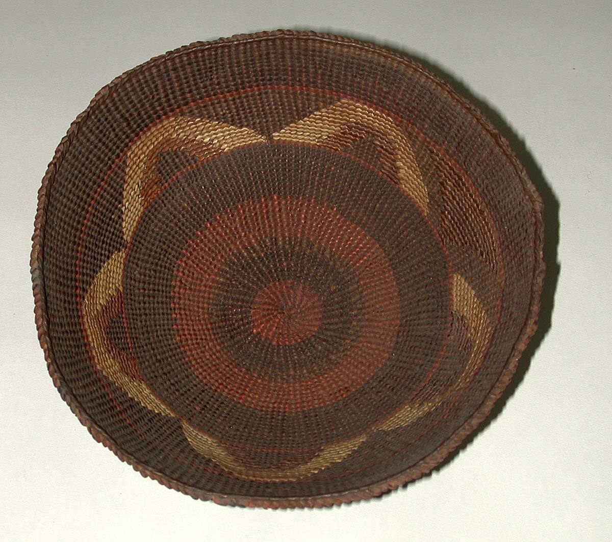 DescriptionOutside horizontal bands in green, orange, and purple. decorative band, with brown, natural and purple.