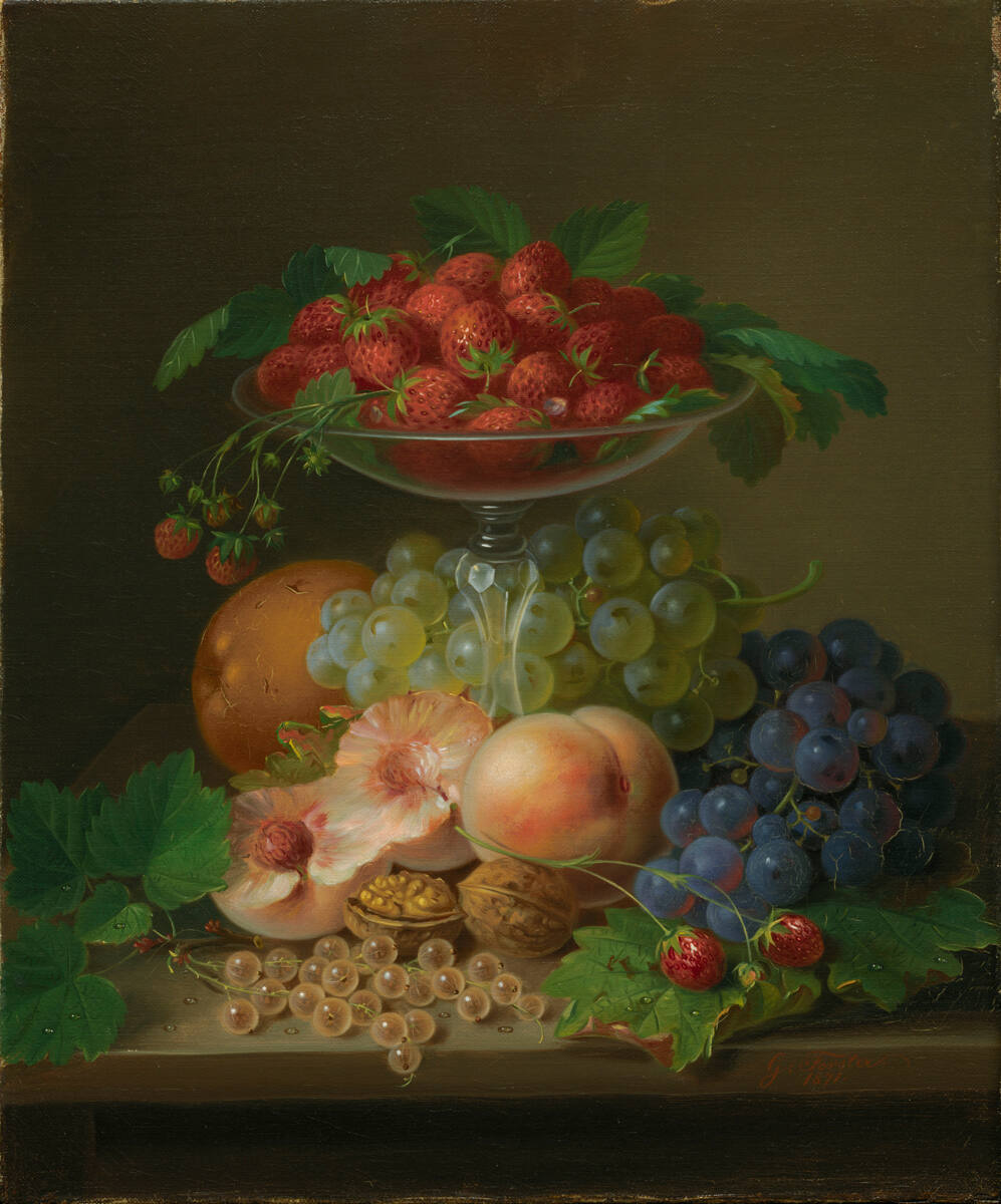 DescriptionLong-stemmed, shallow crystal dish illed with strawberries is surrounded by grapes, peaches, nuts, and an orange on a dark table against a brown backgound.Published References“Pictures at an Exhibition,” Independent (Kansas City, Mo.),