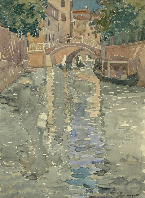Prendergast painted this watercolor during a six-month stay in Venice. In Side Canal, Venice, he expertly reserved, or left blank, the white of his watercolor paper to suggest the bridge railing and figures in the boats. Prendergast's technique serves his subject when picturing the canal water. He introduced washes into other, still-wet washes, allowing the colors to run and blend. He also dripped clear water into the wet wash. The impact of these drops created the light areas with feathered bands in the lower left corner.