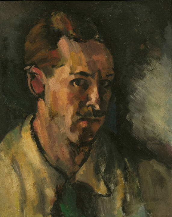 Stanton Macdonald-Wright painted this self-portrait in Paris, where he and other American painters engaged with the revolutionary ideas promoted by European artists in the early 1900s. These artists included the French painter Paul Cézanne. Compare Self-Portrait to Cézanne’s Mont Sainte-Victoire. Macdonald-Wright echoes Cézanne’s noticeable brushwork, diagonal strokes of paint and dark outlining of forms. Both artists chose a somewhat abstract style of painting to present their individual views of the world.