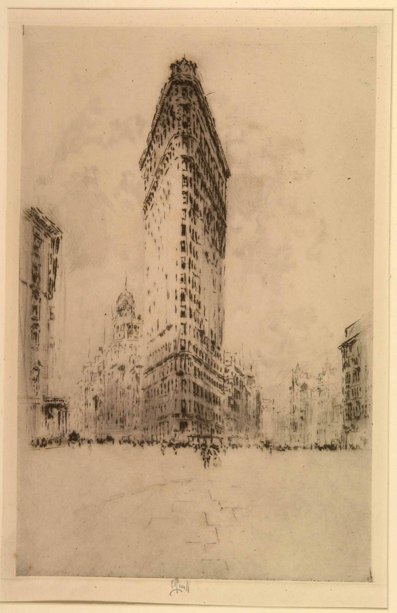 Gallery LabelThe Flatiron Building was one of the first skyscrapers built in New York City. This view of the building intersecting two streets is similar to the views of Paris described by the French Impressionists. Gustave Caillebotte painted Georges Eugéne Haussmann’s new boulevards in a similarly abrupt way, perhaps critical of urban progress and the alienation it brought in its wake.