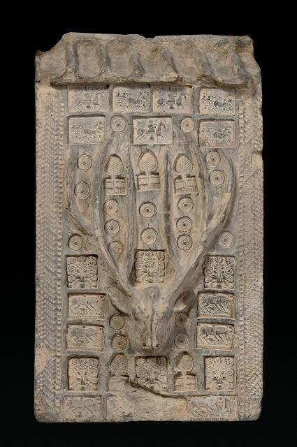 DescriptionRectangular tile in form of a wall with sloping tiled roof; stag's head in high relief. Ground of stamped designs with squares, rectangles, and circles with figures of horses, horsemen, chariots, T'ao T'ieh, and leaf motifs.Gallery LabelThis large brick would have been part of the upper wall of a tomb. Its top imitates the sloping, tiled roofs of real architecture, and its front is decorated with auspicious motifs: a deer head, perhaps signifying longevity, coins denoting wealth, protective monster masks and figures riding horses and in carriages.