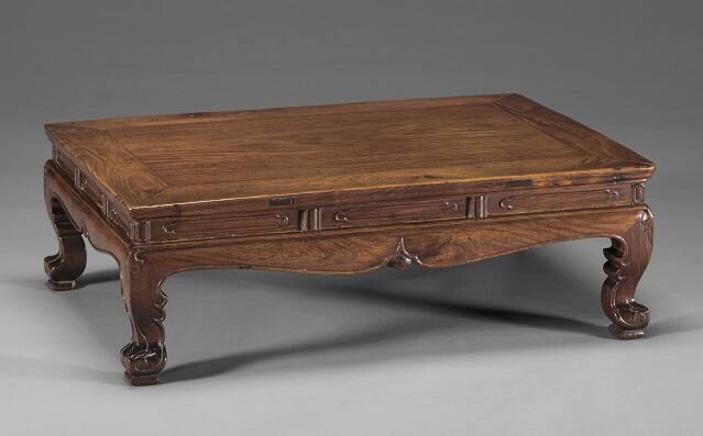 This is the oldest type of Chinese table. In ancient times, before the chair was introduced, the Chinese sat on woven mats with minimal furniture such as low tables and armrests. As couches became popular the low table was transferred to the couch. This is a particularly fine example, with strongly carved “elephant trunk” legs. This shape influenced European furniture during the eighteenth century, where these legs were termed “cabriole.”