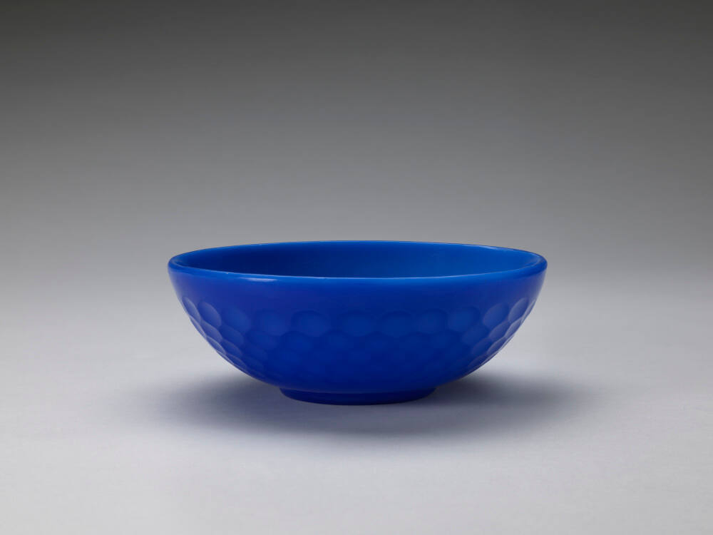 DescriptionBowl has rounded sides and a well-formed foot rim. The sides of the bowl are faceted in a beehive pattern. The glass is very heavy and semi-translucent. The faceting of the bowl is concave, and this contributes to the appearance of a lighter pattern on the exterior of the bowl.