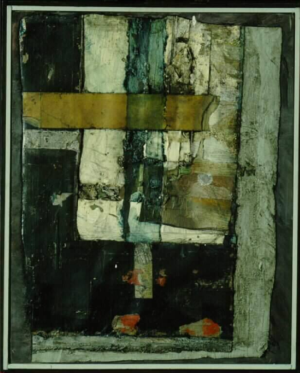 DescriptionNon-figurative collage. Black painted background, adhered several small odd-shaped overlapping pieces of canvas. Black "L" shape left side; grey reverse "L" shape on right. Four red areas in lower center portion. Upper portion mostly white mixed with grey, blue and brown, loosely impastoed in vertical bands. Beige band of layers of masking tape about 2" wide across upper middle portion.Copyright© James Gross