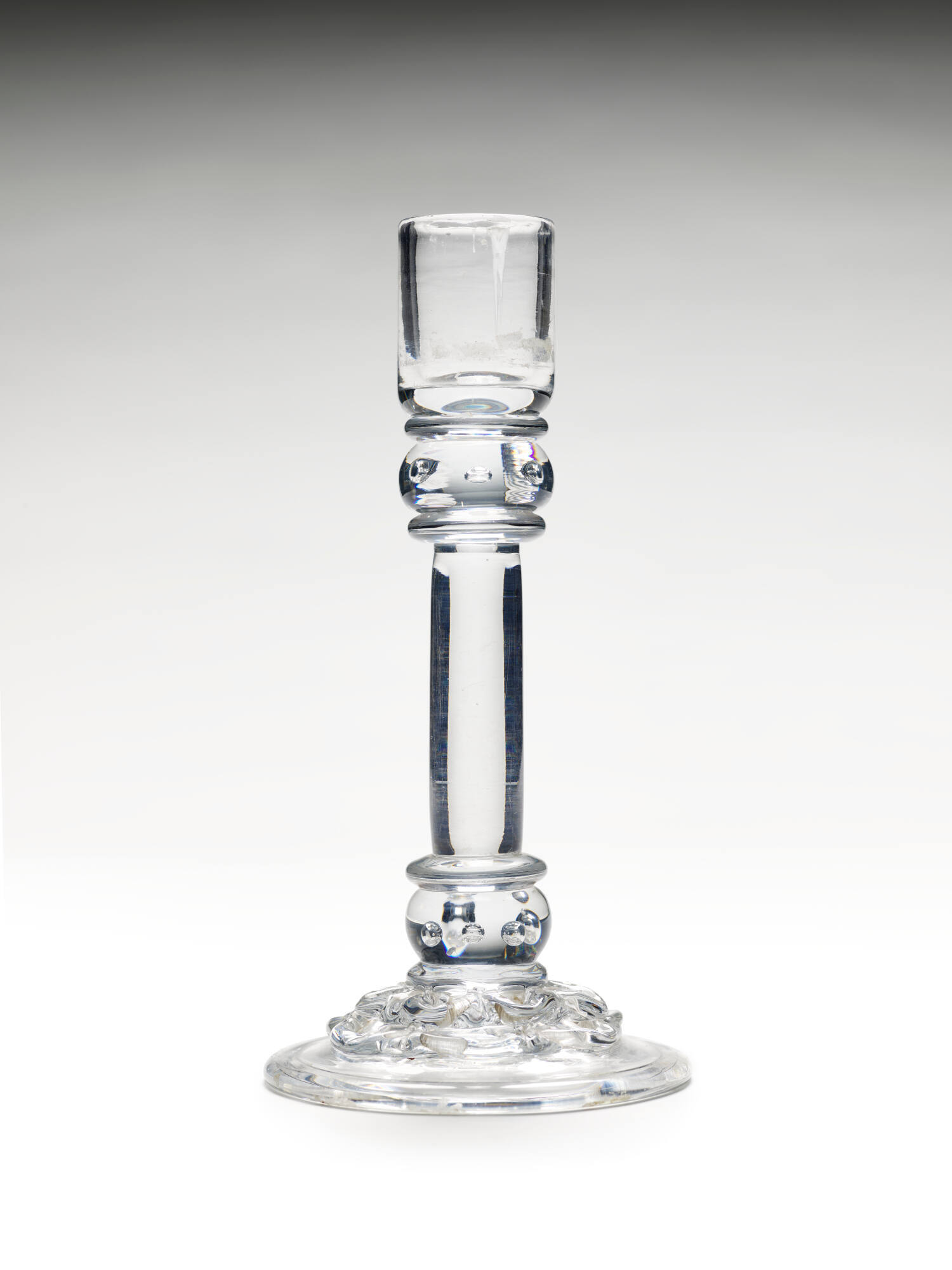 DescriptionColumnar form with cylindrical stem on spreading base with threading; air bubbles in impost and plinth.