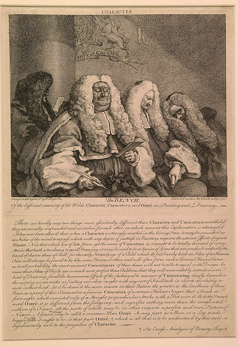 Gallery LabelWilliam Hogarth's engraved narrative scenes are like recorded moments from satirical theatrical performances. He was determined to expose the worst of public behavior and, although he preferred to paint, recognized that printed images produced in multiple could reach and therefore influence many more people than a single painting. In The Bench, Hogarth depicts several disengaged, apathetic jurists of the Court of Common Appeals, including the notoriously corrupt and immoral Lord Chief Justice Sir John Willes, in the foreground. Bothered by what he perceived to be the public perception of him as a caricaturist, Hogarth included below the image a paragraph taken from his treatise, Analysis of Beauty. In it he distinguishes between the honest expression of character and caricature.