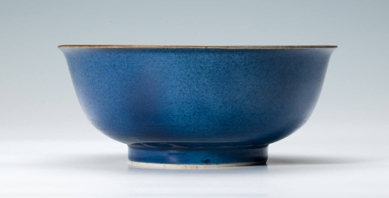 DescriptionBowl covered with powder blue glaze inside and outside. Interior of foot and rim of bowl covered with brown glaze. Glaze stops short of foot revealing narrow white line at rim.