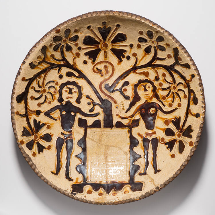 DescriptionAdam and Eve stand under two flowering branches. Single flower head emerges from bifurcation and has slender serpent coiled around its stem. At the foot of the tree, panel inscribed: "The sting of death is sin; and the strength of sin is the lawe 1; of Corinthians. 15 and the 56; vers". Figures and branches, dark brown; serpent, some flowers, lighter brown; notched rim.Published References