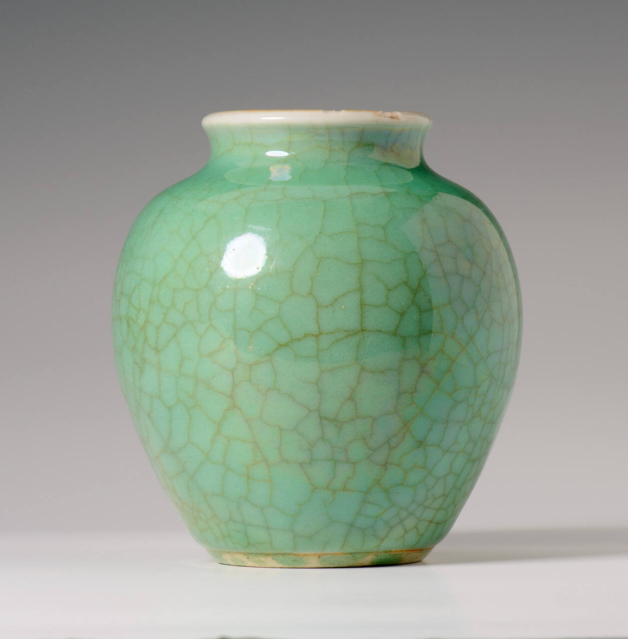 DescriptionSmall jar with crackled gray glaze, with translucent apple green overglaze.