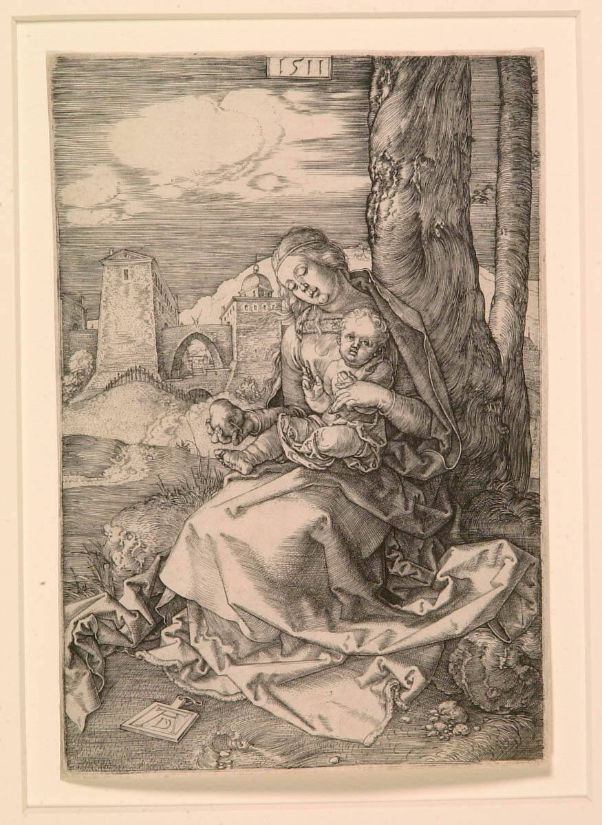Gallery LabelAlbrecht Dürer engaged with the subject of Virgin and Child multiple times during his career, often taking an informal approach to the sacred subject matter. Here, he depicts the Virgin without a halo to emphasize her humanity and poses her casually seated on a grassy knoll on the outskirts of a gated town. She offers Jesus a pear, a maternal gesture that also refers to the sweetness of virtue. The play of lines in the sweeping curls of the drapery and twisting tree trunk animate the composition.