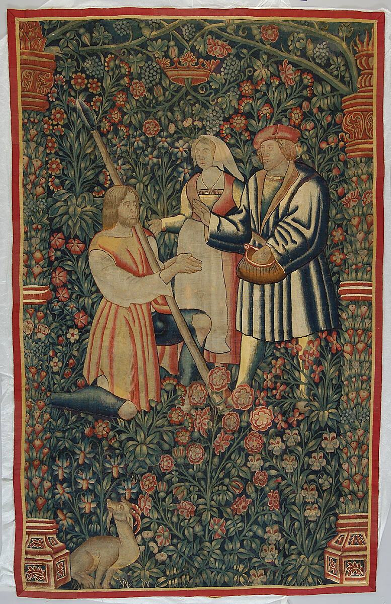 DescriptionColumns of leaves and flowes on right and left edge, with overarching pair of branches emerging from capitals and crossing beneath crown at center top. At center: bareheaded and bearded man with staff leaning on left shoulder, hands pressed together, kneeling before behatted man and woman. Man at right is depicted reaching into pouch at waist. Goat crouching at base of column, lower left corner. Profusely floral field.Provenance