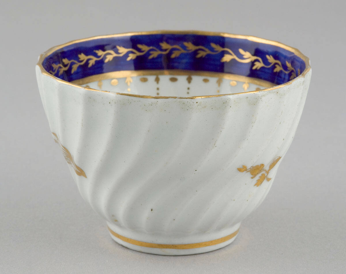DescriptionWhite porcelain with fluted sides. Interior border of dark blue edged in gold with foliate pattern through center of border. Ring around foot and flowers on body of cup painted in gold. (Gold paint badly rubbed.)