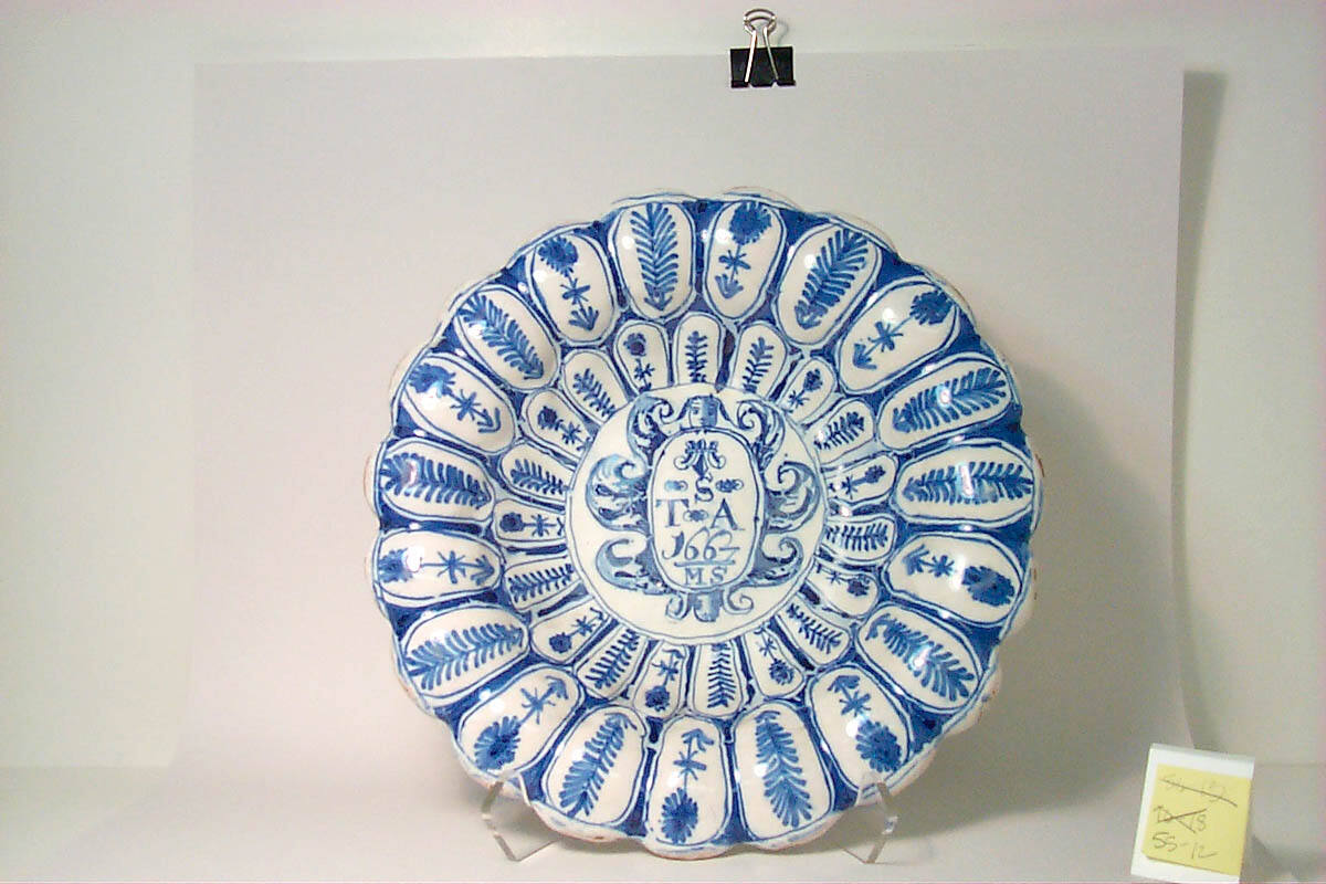 DescriptionFluted side with turned-over scalloped rim, decorated with two borders of alternate mimosa and arrowhead motifs painted in blue. Central, oval medallion with cherub's head at top and bottom and surrounded by scroll forms contains inscription TSA/1667/MS.