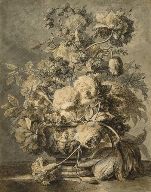 Jan van Huysum was greatly admired during his lifetime for his paintings of elaborate floral arrangements. Here, a brightly illuminated cluster of roses anchors the composition’s sweeping curves. Presented at the height of their beauty, these roses are juxtaposed with flowers past their prime, such as the carnation with the broken stem. Van Huysum appears to be alluding to the cycle of life and the fleeting nature of existence. The drawing’s careful execution suggests that it was intended as a finished work of art rather than a preliminary study.