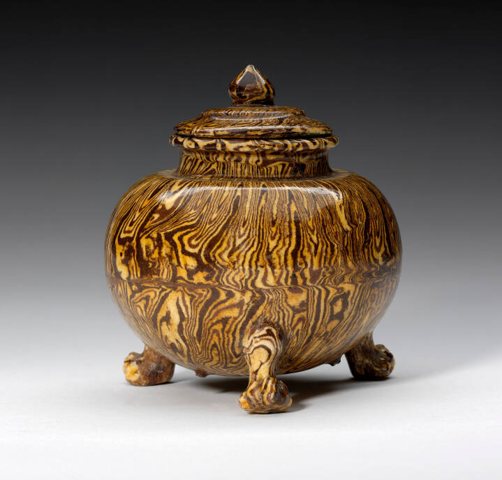DescriptionOvoid body with short cylindrical neck and everted lip, on three lion-claw feet. Low lid with dome-shaped knob. Hard-fired ware of reddish-brown and white clays with transparent yellow glaze.ProvenanceEdith R. Bennett, by August 1952-1955 [1];