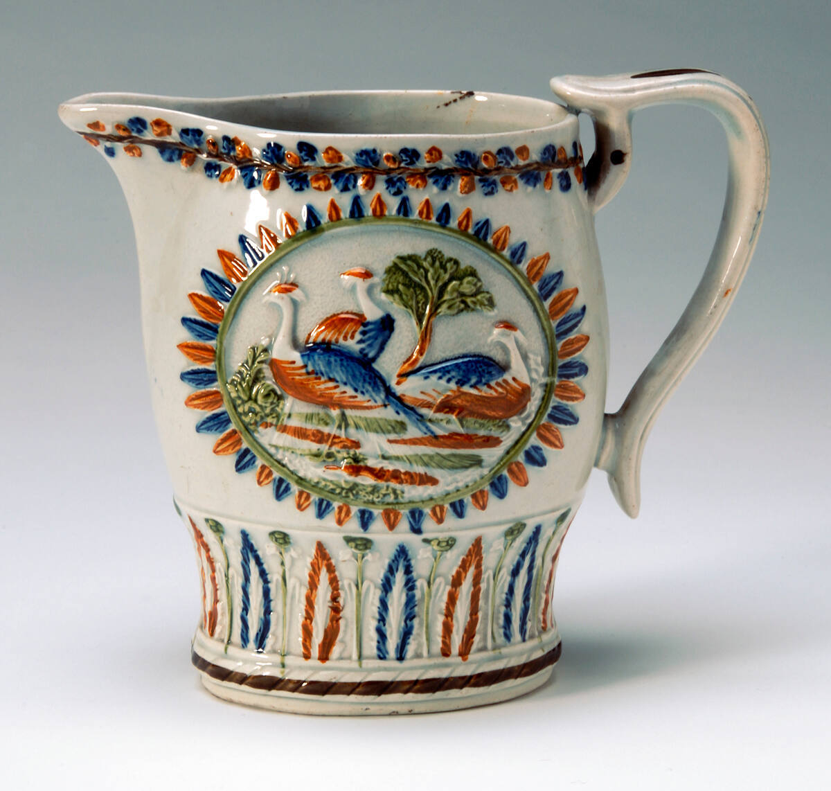 MediumEarthenware with lead glaze and enamel (Pratt ware)