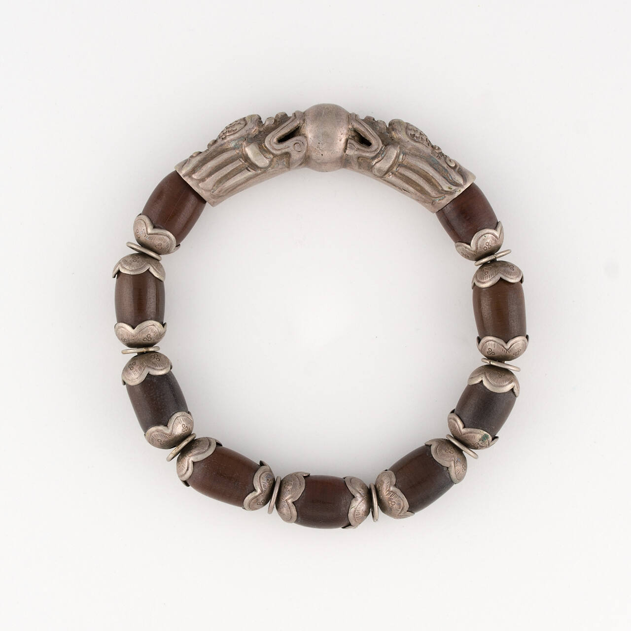 DescriptionBracelet made from brown seeds with silver blossom ends. Two silver fish heads holding a silver ball make the fastener.