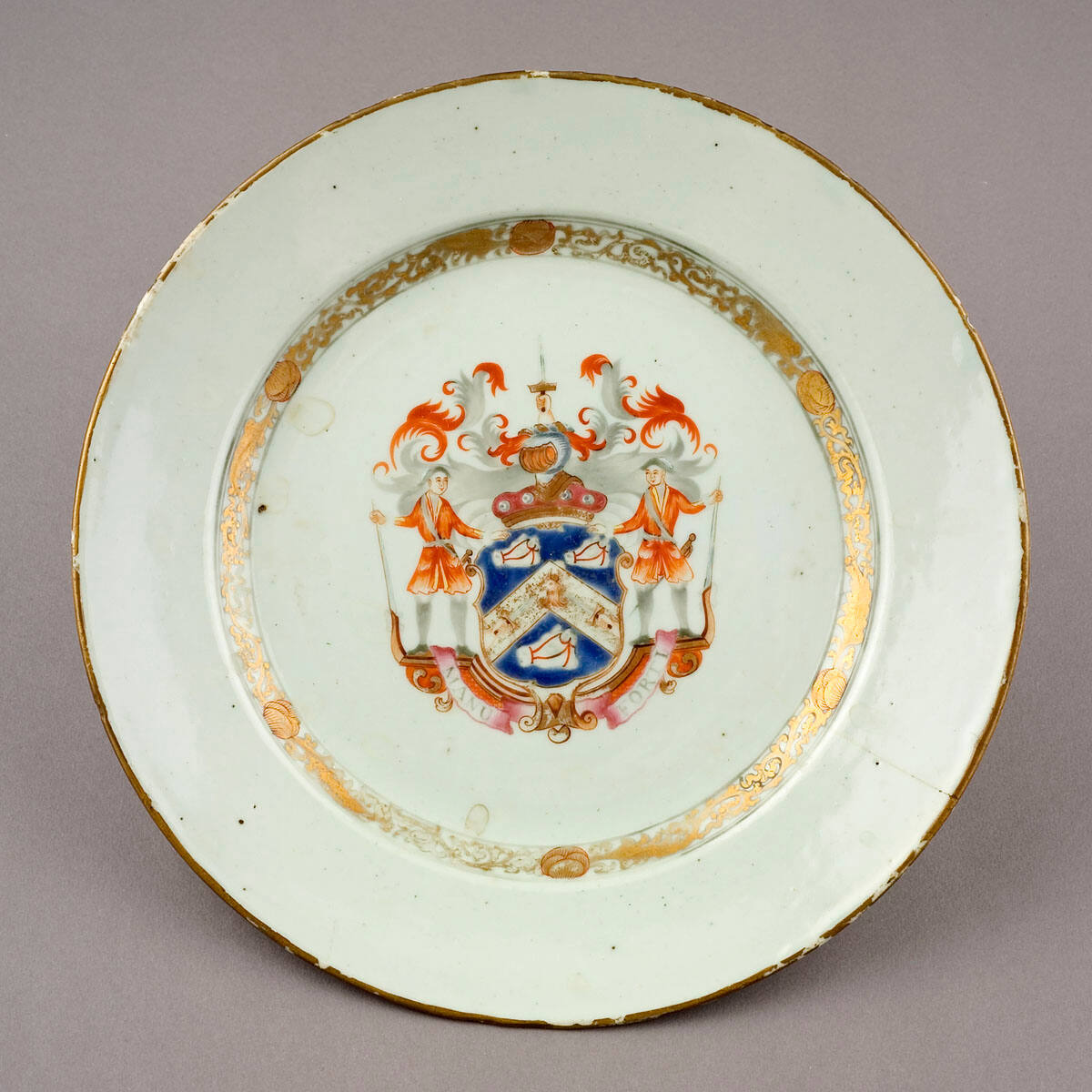 DescriptionPlate with Coat-of-Arms of Baron Reay Mackay in blue, red and gold, consisting of two red-coated figures with rifles on either side of escutcheon with bears the inscription MANU FORTI; gilt scroll and foliate border on cavetto; shoulder is plain except for narrow gold rim.