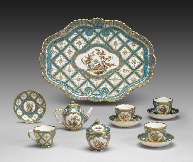 [1] Although not definitively confirmed, this set is likely the “Grand Déjeuner B.C. [bleu celeste] Mosaïque” valued at 1440 livres in the Sèvres sales registers, delivered to Louis XV in 1758 as part of a large diplomatic gift of porcelain to Empress Maria-Theresa of Austria. Manufacture nationale de Sèvres archive, Vy’ 2, folio 85 (bas), copies in Nelson-Atkins curatorial file.