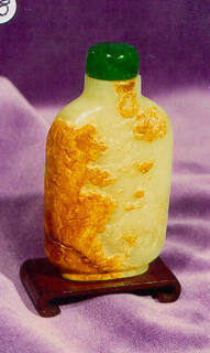 DescriptionFlattened rectangular-shaped, pale yellow jade with brown skin bottle carved on one side with a monkey on a horse and a pine tree beside a mountain, and on reverse, calligraphy denoting the scene, and green glass stopper.