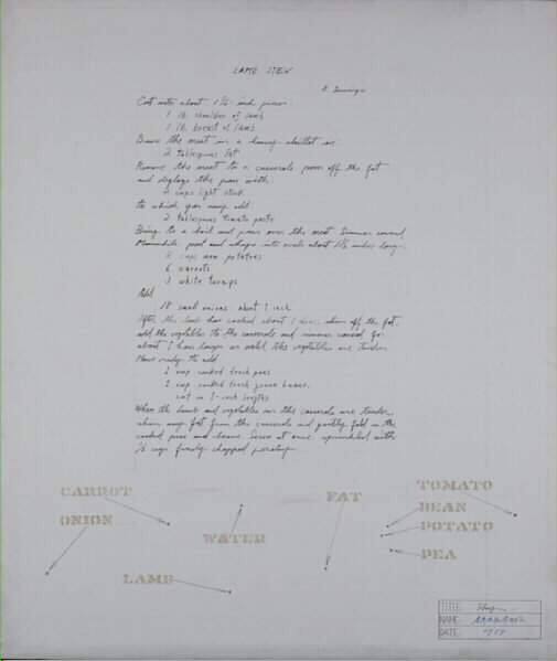 DescriptionOn primed canvas, a recipe for lamb stew is handwritten in felt pen over a pencil traced grid in the upper three-fourths of the painting. A diagram of ingredients (i.e. carrot, onion, lamb, water, fat, tomato, bean, potato, pea) in stenciled paint appears in the lower fourth. At the lower right the artist's signature, title "Sky" and the date--68 appear in a box traced in pencil.Exhibition HistoryArakawa: Decisive