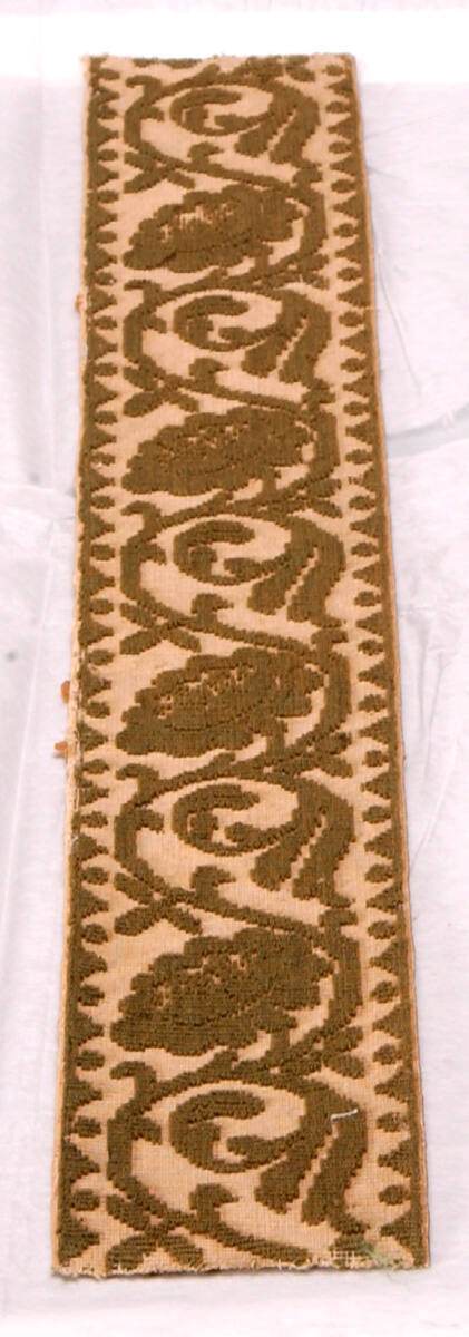 DescriptionAbstract flower border design, olive green on a cream background.